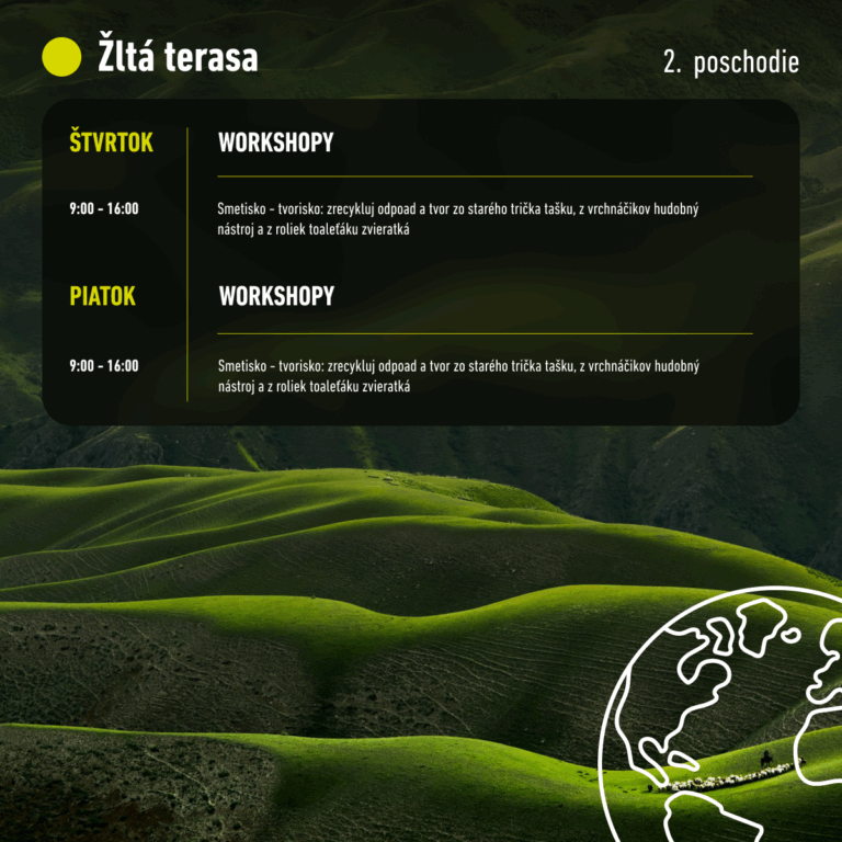 Pre tých, ktorí radi tvoria vlastnými rukami, budú pripravené kreatívne dielne zamerané na recykláciu a udržateľnú tvorbu. Návštevníci budú mať možnosť podporiť lokálnych výrobcov a zakúpiť si poctivé domáce produkty.